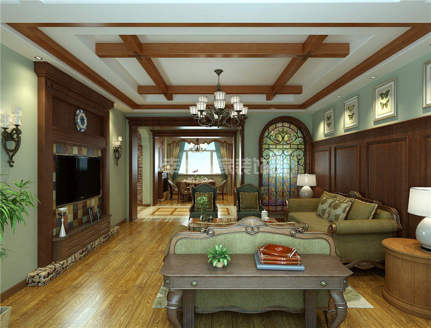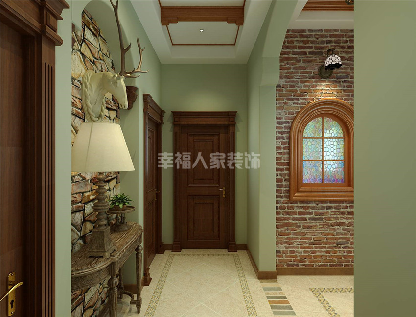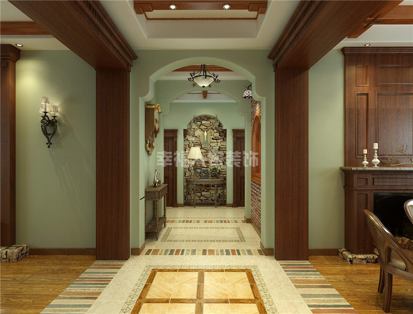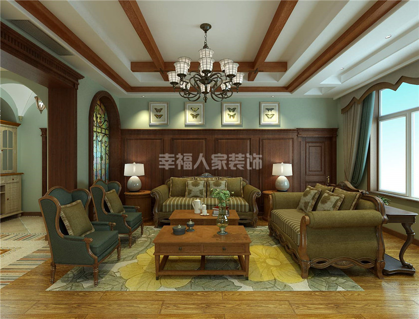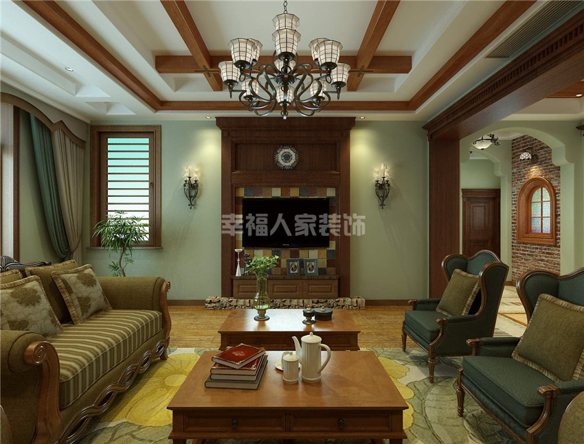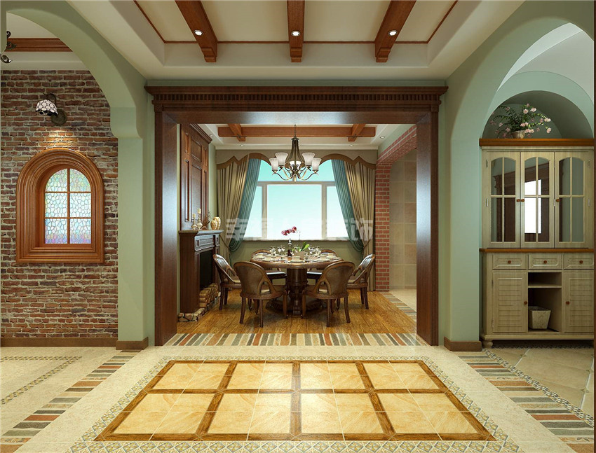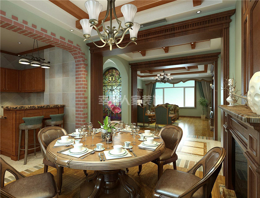 设计说明:本案以古朴的色调,天然的材质,和深沉而含蓄的手法打造全新的美式古典风格,在陈设和色彩选择上多以自然怀旧质朴的气息为主,体现了美式文化崇尚自然的特点。